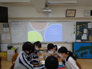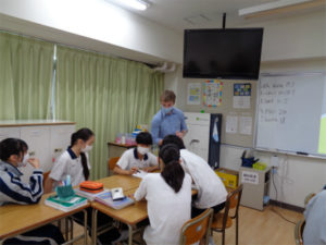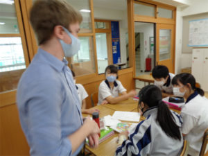2年生英語の授業が盛り上がっていました。生徒たちはグループに分かれ、ALTのビル先生が出題する英語クイズに解答し、正解数を競い合います。ヨーロッパの国々や有名な遺跡、イギリスの一般常識などのテーマが次々に示され、楽しく取り組んでいました。ビル先生は意識的にAll Englishでヒントを出していましたが、生徒たちがそれにうなずきながら、理解している様子を見ると、これまで培ってきたことが随分と身についてきていることがわかる授業でもありました。