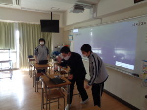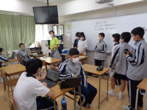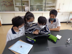 理科室の片隅に集まっていたのは「科学研究同好会」。先日も理科室で撮影をしているところを見かけました。今日はその時の画像を編集している様子です。にぎやかな笑い声と笑顔の生徒たち、どのような発表になるのか今から楽しみです。