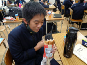放課後前のおやつで出たのは、カカオ・トレース認定のチョコチップを使用した「やわらかチョコパン 未来につなげよう」というパン。「カカオ・トレース」とは、チョコレートとカカオ生産者の未来を創る、ピュラトス社のサステナブル・プログラムです。SDGsプロジェクトの生徒から、昼の放送とおやつの時間にカカオ・トレースについての説明があり、身近な取り組み例として紹介をしました。SDGsプロジェクトでは今後も、『Think globally, Act locally』=「世界規模でものを考え、身近な地域で活動する」ことを実践していきます。