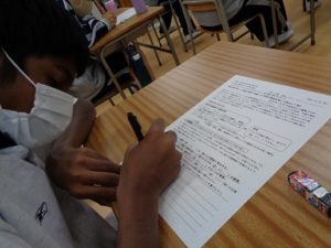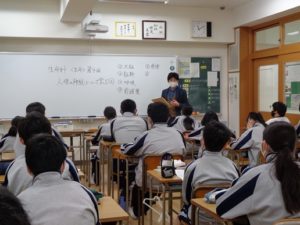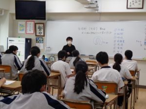 1年生の生命科では前回に引き続き、「自分自身の身体のことを知り、向き合う」ことをテーマに学習しています。本日は、植物状態から奇跡の復活を遂げた息子とその人生を支えた家族の実話を通して、自分の脳、更には生命にとって本当に大事なこととは何か考えることができました。「人間の感情は、他人との関係で育まれる」「脳の成長には、諦めずに努力することが重要」など、今を健康に生きている自分たちにとっても大切なメッセージを受け取っていました。
