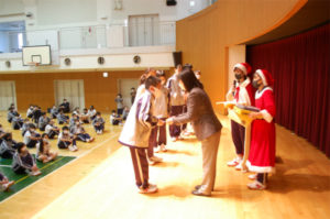 生徒のお楽しみWチャンスは、空気清浄機・松坂牛・スイーツカタログなど豪華景品揃い!ドリームチャンスでは、1Eと3Aが当たり、クラス全員に文房具の景品が配られました。