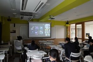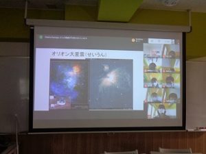 1~3年生AB組希望者対象に,サイエンス・ラボ「ふれあい天文学」の特別授業が行われました。「ふれあい天文学」は国立天文台の主催で,天文学者が直接生徒に向けて,講義をする企画です。今年は,武蔵野東中学校と岩手県水沢市にある水沢VLBI観測所を結び,Google Meetで授業を行っていただきました。講師は亀谷 収先生で,普段は電波望遠鏡を使って研究をされています。今回は,電波望遠鏡を使って光ではわからない宇宙の構造をどのように調べるのかということを中心にしたお話でした。電波を使えば光を出さない暗黒物質の存在も分かってきたり,非常に遠い銀河の様子が分かるなど興味深い内容ばかりで,参加した生徒は充実した時間を過ごすことができました。