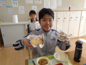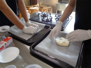 「調理」のクラスは、1人ずつ個別に「簡単パン」を作っています。小麦粉の計量、牛乳の計量、材料を混ぜる順番、こね方、成形、オーブンの使い方などポイントが盛り沢山でした。特に、計量は粉を扱う時には大事です。回数を重ね、微調整の仕方やメモリの読み方に慣れていくと良いでしょう。香ばしく焼き上がったパンは、給食の時間にいただきました。