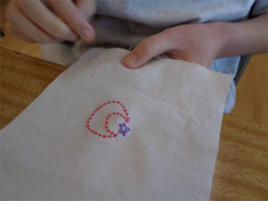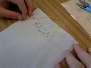 「被服」のクラスは、箸袋に刺し子で模様をつけています。今までの技術を活かし、細かな作業を丁寧に行えていました。