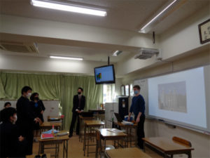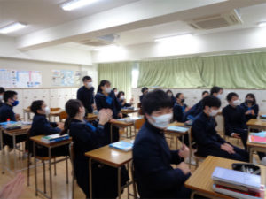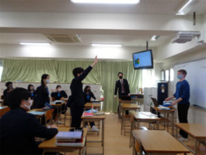 3年生は入試に向けた実戦的な学習が続きます。英語の授業も高校入試問題に取り組む毎日ですが、今日はビル先生による「英語で答えてビンゴ」の授業で気分転換。4つの色別のグループで、ビル先生の作った問題の数々に早押し式で、英語で答えて競います。英国の建造物、世界の食べ物や自然、地名などスライドに映し出されるものや、洋楽を聞いてアーチストとタイトルを答えるなど、多岐にわたる問題に次々に答えていきました。