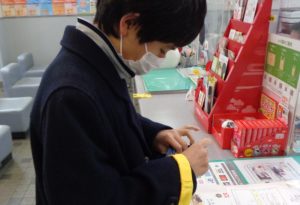 久しぶりの体験の授業で近隣の郵便局へ行って、ハガキや切手を購入しました。スーパーマーケットでの買い物とは違い、郵便局は対面販売で各自が買うものとその枚数を窓口で伝えなければなりません。郵便局の窓口を利用する機会が少ないので、皆少し緊張している様子でしたが各々のスキルに応じた方法で購入することができました。公共の場でのマナーやルールをしっかり守ることが今後の課題です。(例:列に並ぶときに動きまわらない、静かに順番を待つ、商品の受け取りのタイミング等々)