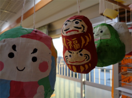 そして最後に着彩です。色彩豊かで、だるまの顔も一人ひとり違い、完成しただるまを並べると「かわいい~」と歓声があがっていました。