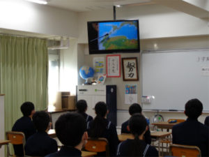 始業式は、各教室へライブ放映する形で行いました。校長先生からは、このような情勢の中の生活や学び方など各人がしっかりと意識していくこと、また画面に映し出した大陸から見た日本列島の地図をもとに、いままでの見方を変えることから気づいて学ぶという観点から話がありました。ここから感染状況に気を付けつつ、新たな学びがスタートします