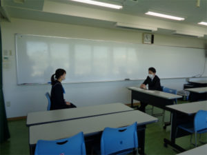 3年生の高校入試が、いよいよ迫ってきました。現在は少人数グループによる学習を中心にしていますが、本番に向けて面接の練習にも熱がこもってきました。これまで人前で考えをまとめて話すことをいろいろな機会に行ってきたことや部活動・行事などに真正面から取り組んできた実体験が自信となり、様々な切り口から深い話ができるようになっています。画像は担任の先生たちと面接練習をしている様子です。最後まで学びを積み上げていきます。