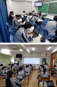 新型コロナウイルス感染症対策として、授業内での生徒同士の共同作業を控えていますが、本校では1人に1台Chromebookが貸与されており、Chromebookを用いて共同作業を行うことができます。