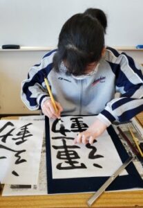 CDEクラスの授業や生活教養では、年中行事や季節に応じた知識(夏であれば熱中症対策、冬なら風邪の予防など)についても学んでいます。1月には、各クラスのHRで「新年の抱負」を語る姿が見られました。毛筆を使って書き初めをしたクラスもあります。国語の授業では「春の七草」や「いろはがるた」「百人一首」などに触れています。また、一般の授業(3年生の3学期は公民分野)では、成人年齢が来年から変更になることを知り、「あと3年で成人!」と驚く様子が見られました。学校での学びや経験が、生活を豊かにしていくことにつながるよう今後も取り組んでいきます。