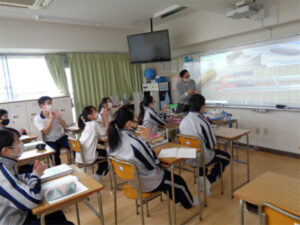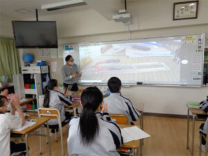 2年生理科の電流による磁界の単元で、レール上に置かれたアルミの棒が、電流が磁界から得る力で動くかという実験の演示を、Webカメラを使って電子黒板に映し出す形で、生徒に示していました。厳しい感染状況の中、生徒が顔を付け合わせての実験を行うことを避けつつ、目の前で起きている科学現象をしっかりとられるための工夫の一つです。演示で電流をアルミの棒に流して動くところがホワイトボード一杯に映し出されると、生徒たちからは拍手が起きていました。