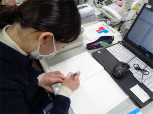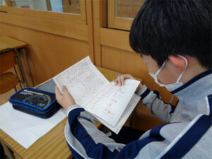 生徒たちは登校すると各クラスの自主学習ノート提出場所に教科別に置きます。朝のうちに運ばれたノートは各教科の先生が内容を見てアドバイスやコメントを書きます。そして帰りのホームルームで返却されます。どんなコメントが書かれているのか、生徒たちは返却されるとすぐにノートを開いて確認し、その日以降の自主学習に生かします。プランノートを使って立てた各自の学習計画は、この自主学習ノートのサイクルをとおして定着していきます。