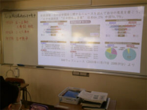 2年生社会科では歴史分野で日中戦争を学んでいます。今回の発展課題は、日中関係に関する世論調査から読み取れることです。中国は日本に対して「良くない印象」を持つ人の割合が52.9%とそれほど高くないことを知り、中国に対する新しい認識が持てました。また、「良くない印象」の理由(中国→日本)では、1位が「侵略の歴史 きちんと謝罪・反省せず 74.1%」と授業で学習している日中戦争を含む日中間の歴史を理由に挙げる割合が非常に高いことに気付きました。ほかにも、尖閣諸島周辺の問題も「良くない印象」をもつ大きな理由となっていました。過去のできごとが今につながっていることを実感し、歴史を学ぶ意義に触れる良い機会となりました。