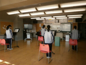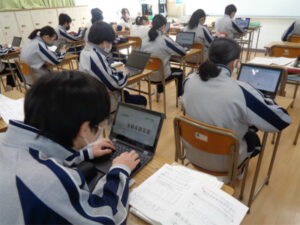 2年生の音楽科授業では、メロディを創作することに取り組んでいます。いくつかのルールに沿ってそれぞれがクロームブックを使って音を確かめたり、予め用意されている伴奏の音源に合わせて弾いてみたりしながら思い思いのメロディを作曲しています。