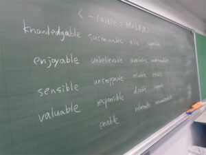 2年生の英語EEコースでは、授業冒頭の時間を、英作文や語彙力強化などにあてています。語彙力では「-ableで終わる単語」などテーマをもうけてノートに書きます。英作文では、高校入試レベルのやや難易度の高いものを、1日1題行っています。友達の答えを聞く中で、自分では考えつかなかった表現を知ることもでき、刺激になっているようです。互いに学び合う時間を大切に、これからも授業を行っていきます。
