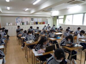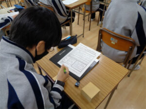 本校独自の教科である『生命科』は、「自分の存在の重さを知り、他の人の重さを感じることができる」という理想の生徒像を目標に実施されています。1年生の生命科は、〈将来観〉の一環として「職業調べ」をしています。各々が興味を持った職業についてインターネットや書籍を用いた調べ学習をしてきました。今日は来週の発表に向けた原稿作りを行い、これまで調べてきた内容について2分程度にまとめています。仕事の内容だけでなく、その職業に就くために必要な条件についても調べるなど、より具体的なところまで知ることで学びを深めています。