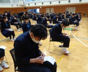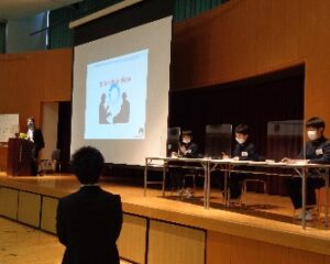 3学期の講座は「新聞記者から学ぶ『伝える』力」というテーマで開かれました。読売新聞より講師をお招きし、メモの取り方やインタビューのポイントについて学びました。生徒一人ひとりにはメモ帳が配布され、実際に講座の内容で大切なところをメモしながら聞いており、大変さを実感した生徒も多かったようです。また、各学年から代表者を募り、インタビュアーとしてたくさん質問をするという活動もありました。今回の講座で学んだポイントの5W1H(いつ、どこで、だれが、何を、なぜ、どのように)を、実生活のコミュニケーションにも大いに活かしてもらいたいと思います。