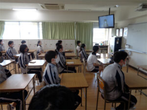 通常の生活時間帯での学校活動に戻り、今日は久しぶりに全校朝礼が行われました。生徒は各教室で放映される校長先生の話を聞き、3月に入り今までの活動や学習をどう仕上げていくか、改めて目標を持てたようです。