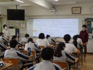 本校では教科の枠を超えて学ぶ「コラボ授業」を行っています。今回は『理想的なコンディションを作る食生活』と題し、保健体育と家庭科での実施です。オリンピックや国際大会にも出場経験のあるアスリートの方が日常や大会前に意識していることをまとめたワークシートを使って学びました。カロリー計算や健康に過ごすための献立の立て方を学んできた2年生ですが、実際のアスリートの方の声を知ることで食事が体に及ぼす影響の高さを実感できたようです。以下生徒の感想です。