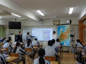 2年生は「中部地方の気候と季節風」というテーマのもと社会科と理科の2教科で、教科横断型の授業(通称コラボ授業)を行いました。中部地方の単元では、季節風がこの地域の気候や人々の生活に大きな影響を与えていることを学びます。ここから、そもそも「なぜ季節風は、季節によって吹く向きが変わるのだろう?」という疑問が生まれ、これを理科的な視点から考えていきます。「風は高気圧から低気圧に向かって吹く」ことや、「夏に発生する小笠原気団」と「冬に発生するシベリア気団」が関わっていることなどについて、代表の生徒がわかりやすく解説をしてくれました。異なる教科の知識が結び付き、教科の枠を超えたよい学びの機会となりました。