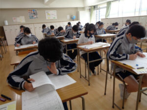 学年レクで思いきり楽しんだあと、1・2年生は模試に挑んでいます。学期に一度の校内模試で、生徒は現在の自分の力を試し、足りない部分は今後の学習プランに生かすことが目的です。