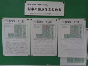 1~3年AB組が取り組んでいる「ニュースファイル」は,新聞記事を読んでその内容を書き出し,自分の意見や感想を書くというものです。2年生では,特に新聞記事の要点をまとめる要約を行っています。「ニュースのまとめサイト」などがネット上で散見される昨今だからこそ,読んだ文章を自分で要約する力は,将来必要なスキルのひとつです。よくまとめられた友人の要約と自分のものを比較して,学べる部分は今後の参考にしてほしいです。