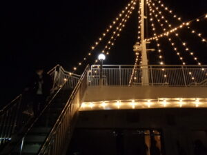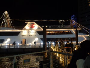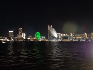 クルーズ船では、コースメニューに舌鼓。食後にはオープンデッキで横浜の夜景を楽しみました!