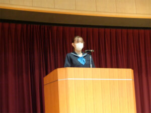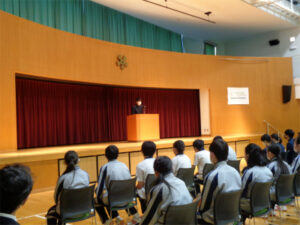 英語スピーチコンテストが校内にて行われ、クラス予選を勝ち抜いた18名が本選に出場しました。1年生は”My favorite”、2年生は”My memory “、3年生は”My opinion on SDGs” のテーマで発表しました。高い英語力だけでなく、聴衆に訴える工夫がそれぞれに見られ、どの生徒のスピーチもとてもハイレベル。発表を聞いた生徒たちも大いに刺激を受けたようです。今年度の英語学習の集大成に相応しい時間となりました。