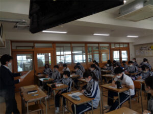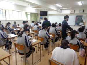 2年生では「福祉」「国際理解」「命の尊厳」「将来観」を単元とします。今日は「福祉」の導入です。はじめに車いすやアイマスク体験をしたことがあるか、福祉施設での活動や災害の起きた場所での支援活動を行ったことがあるかなどアンケートをとり、クラスメイトの体験も共有しました。最後に「福祉」とは何かについて言葉の意味を知ることから考えを深め、学ぶ意義について考えてみました。