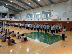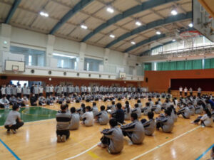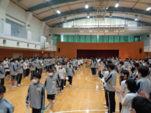 友愛会会長のお祝いの言葉のあと、2年生副会長からは、これから所属する委員会を選ぶ際のポイントについて、3年生副会長からは新しい友達のつくり方などの具体的なアドバイスがありました。その後は、総務委員会が作成したガイダンスブックを通して、一日の流れと各委員会についての説明があり、最後は2・3年生で花道を作り1年生に向けて歓迎の拍手を送りました。
