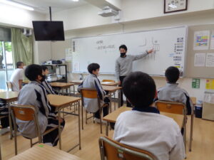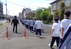 1年生の最初の体験では、東小金井駅までの通学路を実際に歩き、安全上気を付けるポイントや駅員さんのいる改札の場所などを確認しました。また、教室に戻った後は電車やバスでのマナーについてクラスで話をしています。中学生としての自覚をもち、周囲に気を遣いながら、自分自身で気を付けて安全に通学できるようになることを目指します。