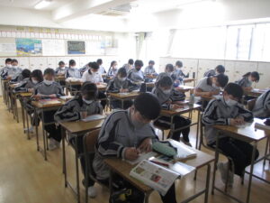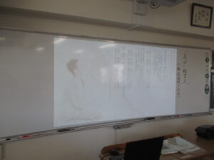 2年国語教科書単元「季節をうたう」には、照屋林賢さんの「春でぇむん」という詩が掲載されています。春の訪れを五感で感じ取る内容で、沖縄の方言が印象的に使われている詩です。その発展学習として宮沢和史作詞・作曲『島唄』の歌詞鑑賞を行いました。歌詞の一般的な解釈だけでなく、宮沢さんが詞の奥に込めたメッセージを読み取ることは、生徒にとって良い刺激になったようです。今年度は映像作品や歌詞の鑑賞も含めて、より発展的な解釈や表現ができるように教材を工夫していきたいと考えています。