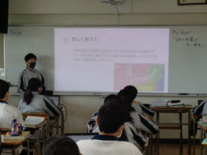 2年生の社会科では、教科書に載っている話題について深く調べて、発表をする「My Quest」がスタートしました。今年から、SDGsの17のターゲットとの関連についても盛り込むことにしており、知識や関心の幅が広がることが期待されます。プレゼンテーションを聞く側の生徒たちは、ルーブリック評価で採点をしており、相互学習のよい機会となっています。