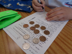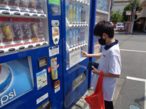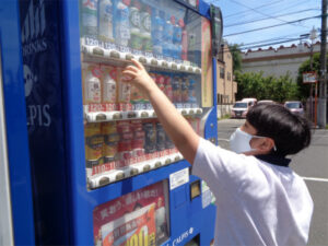 体験・実習の授業では、生活に必要な内容を経験を通して学んでいきます。第3回目の体験は「買い物」でした。今回は、スーパーではなく学校の近くの自動販売機で各自が飲み物を買いました。今日のポイントは、買いたい商品の値段の確認、一番欲しい物がなかった時の判断、必要最低限の硬貨の投入、買った品物と釣銭の取り出し、財布の開閉でした。お釣りを受け取るために釣銭レバーを押し下げること、お釣りを取ったらすぐに財布に入れて財布の口を閉めること等については声かけをしています。学校に戻った後、各自でプリントに商品の値段を記入し、財布の中の残金の確認を行いました。特に、「何を買って、何円使ったか」を自分で覚えておくことは今後の宿泊学習での買い物でも必要とされるスキルです。これからも機会を設けて練習していきたいと思っています。