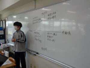 SDGsプロジェクトは、委員会活動とは別に、生徒が希望制で参加して活動するもので、今年度は30名以上が所属しています。今日は、今年度取り組んでいきたいことについて、意見を出し合いました。思考ツールの「座標軸」を使って、各自の意見を分類、整理していきます。今後は実行していくことをいくつかに絞り、少人数のグループに分かれて活動をスタートさせます。