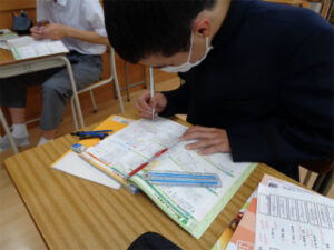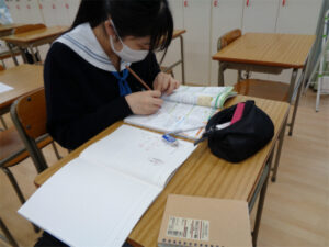 3年生の特別進学学習(通称“特進”)は、月・水・金の放課後に実施する本校の進学指導の柱の一つです。10人前後のグループで、入試に向けての学習を進めます。4月以降始まった特進も約10回を重ね、各グループで仲間と切磋琢磨しながら学んでいる様子が見られました。集中力を持続しながら、適度に笑いのこぼれる良い雰囲気で学習が進んでいます。画像は数学作図問題や国語の読解問題に取り組む2つのグループでの様子です。