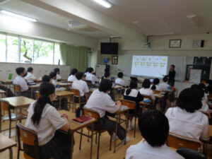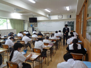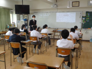 1年AB組の土曜日の学習講座を行い、中学生らしく学んでいる様子を保護者の方にご覧いただきました。さらに保護者向けに、各部活動の顧問から活動についての説明も行いました。