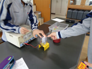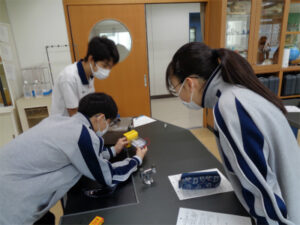 3年生理科は生物分野の学習を終え、化学分野に入りました。3年生化学は「イオン」を学習します。スポーツ飲料やゲームやスマホの充電池など身近な存在でありながら、普段あまり気にしないで使用している「イオン」の正体と電気分解や電池の原理に迫っていきます。実験も集中して取り組んでおり、関心の高さを感じました。