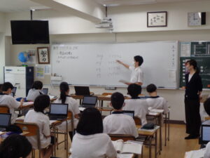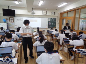 本校では、共通のテーマを複数の教科にまたがって学ぶ教科横断型授業(通称「コラボ授業」)を実施しています。今日は技術・家庭科と数学科のコラボで、コンピュータの基本操作の一つである表計算処理ソフトの使用方法を学びました(教科の扱いとしては技術分野の情報になります)。