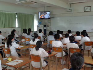 今回の授業では、『自閉症の僕が跳びはねる理由』の著者でもある東田直樹さんの中学生時代のドキュメンタリー番組を視聴し、自閉症への理解を深めました。会話でのコミュニケーションが苦手なものの、文字盤を使って自分の気持ちを伝える東田さんから「ぴょんぴょん跳びはねて手を叩く」ことには理由があるというメッセージがあり、「それぞれの行動には一つひとつに意味がある」ということを改めて学びました。生徒からは、今後の学校生活や友だちへの接し方に役立てたいという感想が多く寄せられました。