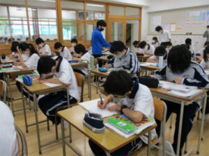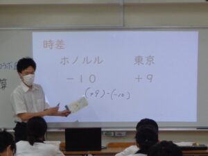 一見複雑に思える時差の計算ですが、東経を正の方向、西経を負の方向と捉えれば、正負の数の計算と同じ要領で簡単に解くことができます。生徒たちは、数学科で学んだばかりである正負の数の加法・減法を使い、社会科の知識もフル活用しながら、様々な時差の問題に取り組みました。時差の計算方法を理解するだけでなく、正負の数に対する理解を深める良い機会にもなりました。今後も様々な教科でコラボ授業を実施していきます。