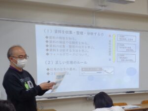 本校には、生徒それぞれの興味・関心から発した事柄に対して「問い」を設定し、オリジナルの「答え」を構築していく探究科という教科があります。今回は1年生の初めての授業ということで、今後の個人探究の基礎となる情報収集のやり方や引用のルール、思考法や訴求力について理解し、今後のスケジュールを確認して探究科の概要を学びました。