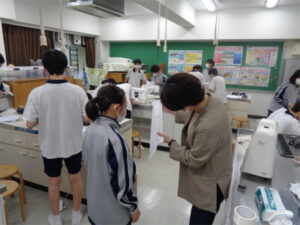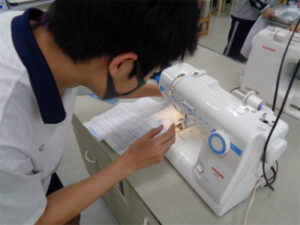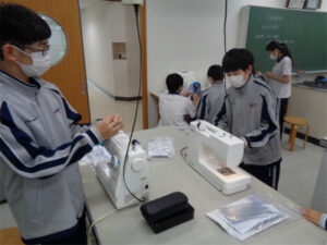布を用いた製作として、ボトルカバーを作り始めました。昨年は手縫いで箸袋を作りましたが今年はミシン縫いでの製作になります。ミシンを使用するのは小学生以来の生徒も多く、ボビンの巻き方や上糸のかけ方等を復習してから製作に入りました。まずは練習用の布でミシン縫いの感覚を思い出します。印に沿って縫い進めること、返し縫いの長さも試してから作品の本縫いです。印に沿ってしつけ縫いし、ミシンを使って慎重に縫い進めます。行程の一つひとつをじっくり行うことで、丁寧な作品作りがスタートしています。