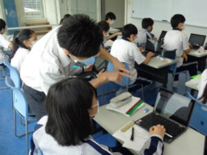 現在学習している1次関数の文章問題は、条件や状況を読み取って正確なグラフや表を作っていくことで、スムーズに解き進められます。今回の授業では速さに関する複雑な問題を扱い、Chromebookを用いてグラフを作成する練習をしました。グラフを作ってみると、自分の考え方の間違いは何だったのか、どこの交点を求めれば答えが出るのかなどが一目でわかります。より正確なグラフを書く大切さに気付く良い機会となりました。