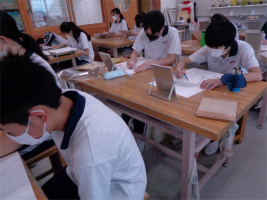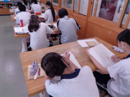 3ABが取り組んでいる自画像は「中学3年生の私」というテーマのもと、今の自分を表現する描画方法を探るため、顔の表情や向き、ポーズや背景をどのようにするのか考えながら下絵の制作を進めています。じっくりと鏡を見ながら鉛筆で描き進めていく中で、自身の興味や関心を見つめる機会となり、いろいろなアイデアが生まれてきています。下絵の完成後は、アクリルガッシュによる着彩に入って完成を目指します。