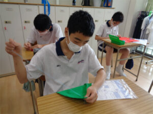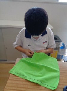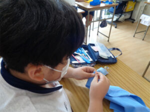 「実習・体験」は2時間続きの授業で、生活に必要なスキルを経験を通して学んでいきます。現在取り組んでいるのは被服で、基礎縫いの練習を終えて「布巾の製作」に入りました。たくさん練習をしたので、糸通し、玉結び、並み縫いは独力でできる生徒が増えています。難しいのは「玉止め」で、結び目を作るためにはどのくらい糸を残しておかなくてはならないのかということや、糸を引っ張り過ぎず、同時に、結び目が布から浮き過ぎない丁度よい力加減はどのくらいか、ということに苦心する様子が見られました。1学期、じっくりと被服に取り組む中で習得していければと考えています。