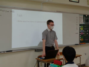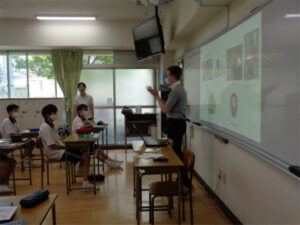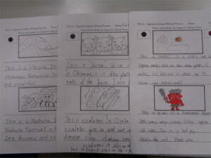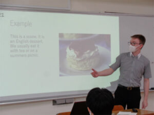1年生の英語の授業が盛り上がっていました。ALTのビル先生が、1年生とThis is ~を練習した後、見せたのはイギリス食文化を代表する「スコーン」の画像。スコーンの上にトッピングされているのは、ジャムと生クリーム。ただし順序が大切で、上からジャム・クリームの順が正しく、クリーム・ジャムの順は絶対に“No!”だそうです。これを例に今度はJapanese culture(日本文化)を紹介する課題が、ビル先生から出されていました。This is ~ を使いながら、できるだけビル先生が知らないことを書こうと生徒たちも一生懸命考えていました。できたものを見ると、シーサー、ねぶた、浮世絵をはじめ、いちご大福や大阪のエスカレーター左あけなど多種多様なものばかりでした。
