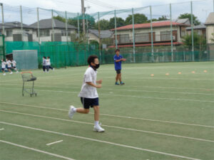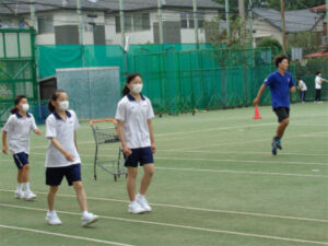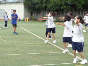 保健体育と音楽がコラボする教科横断型授業が1年生の短距離走の単元で行われました。リズムをとることの効果について音楽の先生から話があった後、体育の先生がそれを取り入れた歩き方→走り方を説明。運動場のトラックにテンポの良い音楽を響かせながら、実際に歩く、走るを楽しそうに体感していました。