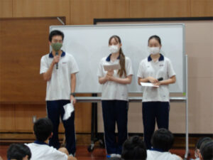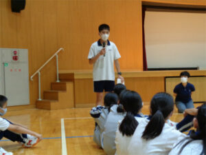 2学期予定のスポーツ大会に向けて、始動しています。赤・白・緑の縦割り3チームにわかれて、優勝を目指します。それぞれのチームリーダー3人が立候補により決まり、チームの顔合わせとともに、リーダーたちによる意気込みをメンバーに話していました。これからリーダー中心に練習に取り組んできます。